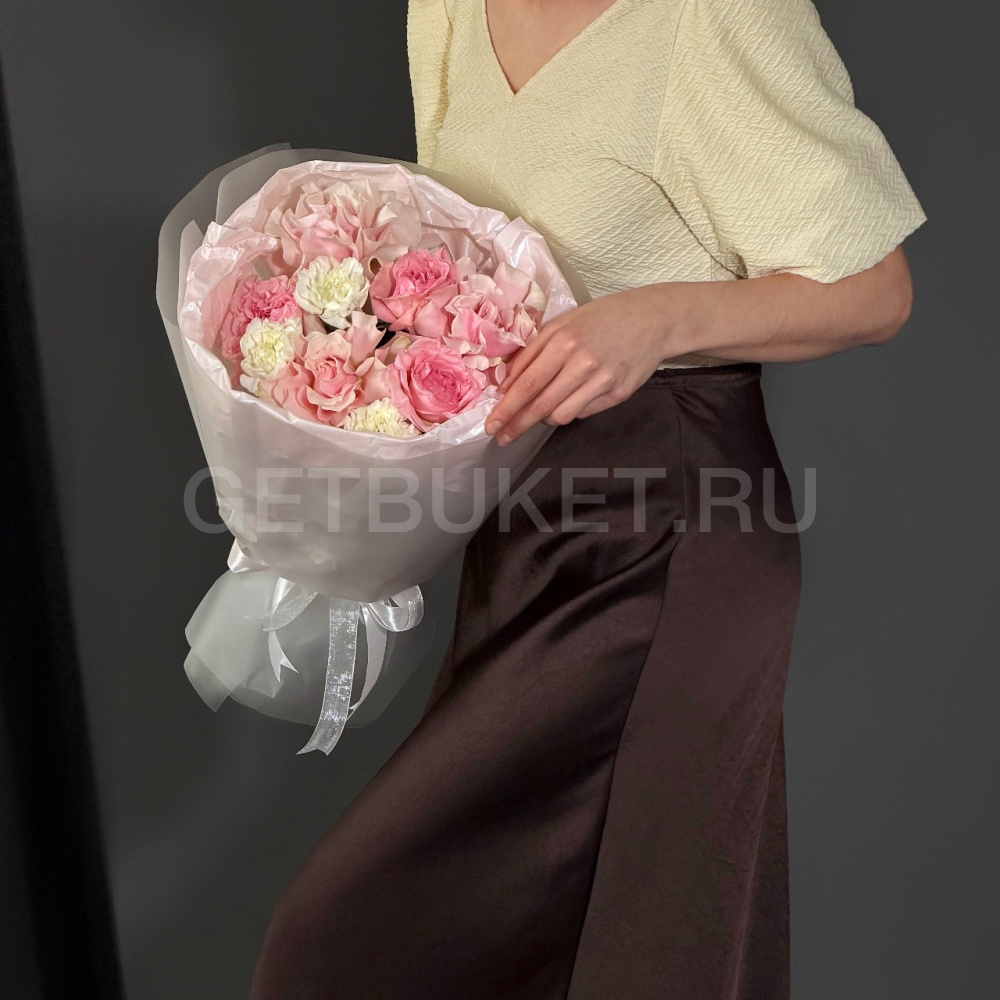 Букет розовых роз с гвоздиками4 650 ₽Букет розовых роз с гвоздиками 4 650 ₽ -
